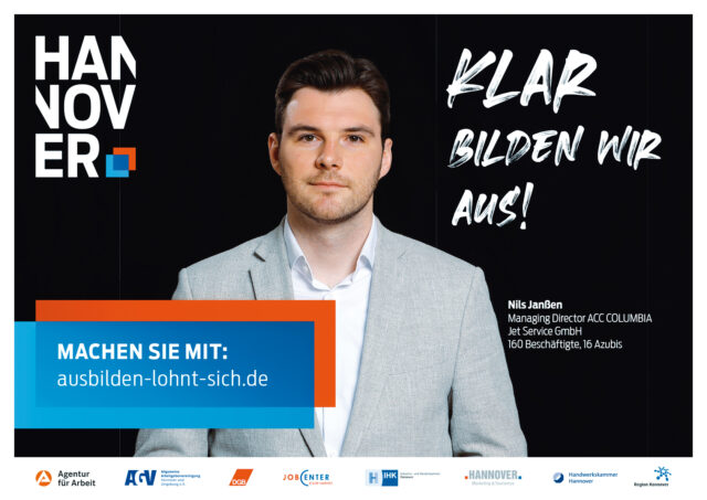 Mit dieser deutlichen Botschaft wollen Arbeitgeber in der Region Hannover junge Menschen auf ihr Ausbildungsangebot aufmerksam machen. Nachdem im vergangenen Jahr Torsten Wagner von Wagner Group Teil der vom Regionalen Bildungsbeirat initiierten Plakatkampagne war, ist in diesem Sommer Nils Janßen von ACC Columbia Jet Service im Stadtbild von Hannover zu sehen.