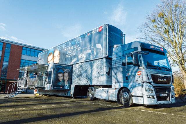 Normalerweise fährt der 32-Tonner auf die Schulhöfe, um ganzen Schulklassen einen praktischen Einblick in die Metall- und Elektro-Industrie zu geben. Zurzeit steht der M+E-InfoTruck still – zwangsweise wegen der häufigen Schulschließungen. Doch die Berufsorientierung findet trotzdem statt: Die Berufsberater aus dem Truck schalten sich per Livestream in die Klassen und präsentieren die 40 spannenden Ausbildungsberufe der Branche virtuell. Athanasia Lüders, Lehrerin an der Leine-Schule in Neustadt, hat sich mit ihrer 9. Klasse im Fach Wirtschaft als eine der ersten für das neue Format angemeldet. „Der ME-BerufeStream ist ein gutes Beispiel dafür, wie auch im Moment hilfreiche Maßnahmen zur Berufsorientierung durchgeführt werden können“, sagt sie. Dass das Angebot bei den Schülern gut ankam, zeigte eine virtuelle Umfrage: Demnach konnten sich acht von elf Schülern vorstellen, sich um einen Ausbildungsplatz in der Metall- und Elektro-Industrie zu bewerben.