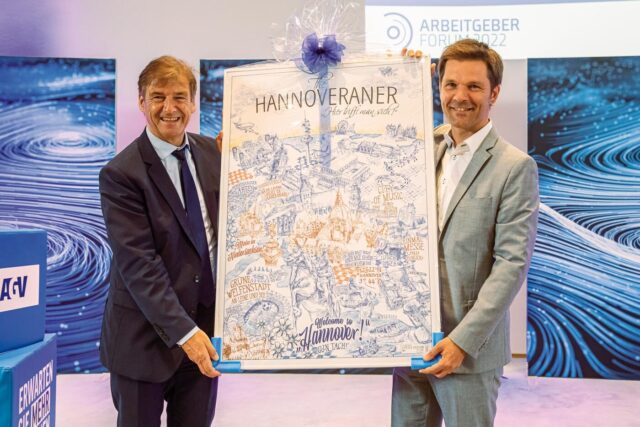 Glücklicherweise ließ die Corona-Pandemie nach zwei Jahren, in denen das Arbeitgeberforum rein digital oder mindestens hybrid stattfinden musste, nun wieder eine reine Präsenzveranstaltung zu. Auch hatten die Veranstalter das Konzept etwas verändert, sodass das Forum am Abend auf der Dachterrasse des Schlosses bei guten Gesprächen, Barbecue und einem herrlichen Sonnenuntergang über den Herrenhäuser Gärten ausklang.