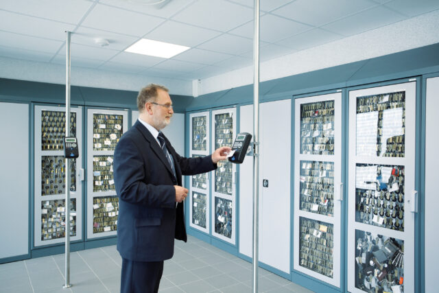 ▼ Durch Hightech bestens gesichert: Im Schlüsselraum muss sich der Mitarbeiter ausweisen und einen PIN-Code eingeben, erst danach bekommt er vom Lagezentrum für kurze Zeit die Möglichkeit, den angeforderten Schlüssel zu entnehmen.